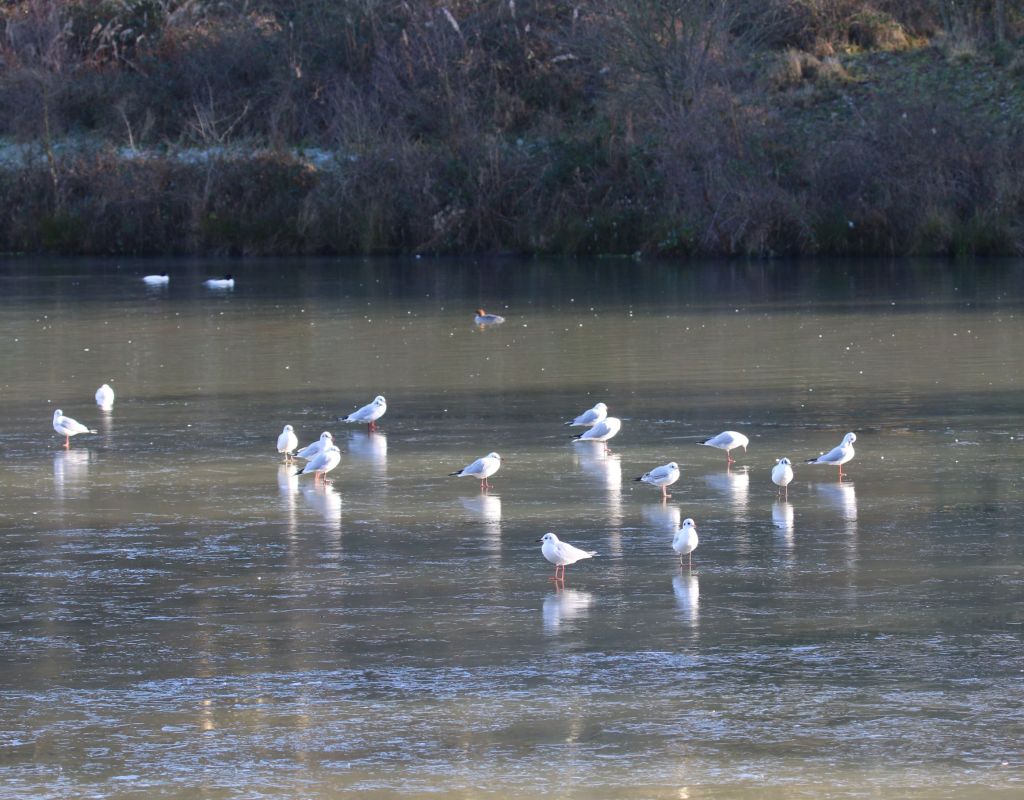 “Black-headed gulls, wearing winter plumage and puzzled expressions, stood awkwardly on the ice”. See also one female and two male Goosanders in the open water to the rear of the gulls.