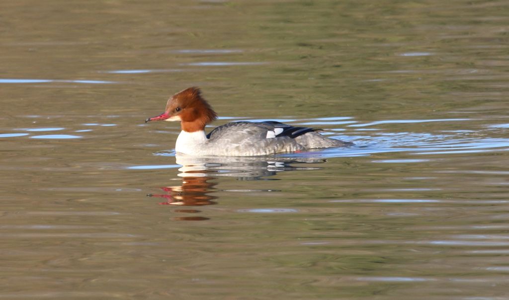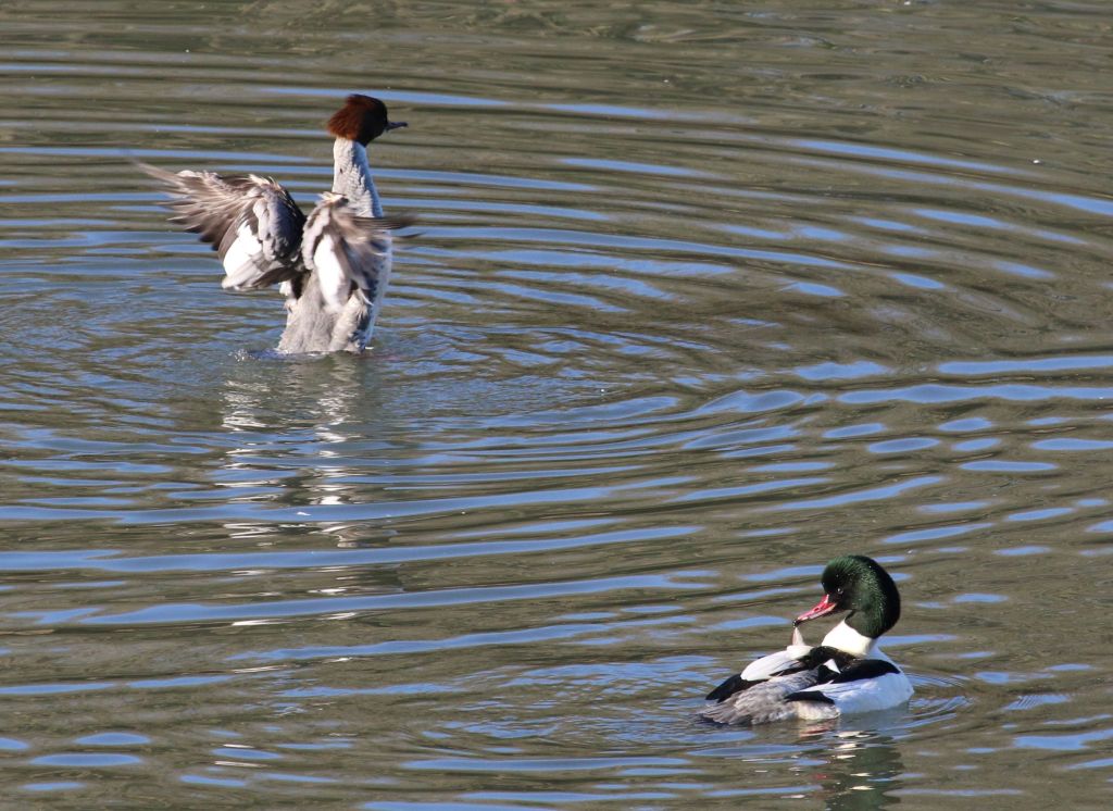 Most of the usual suspects were there, including Canada Geese, Mute Swans and a Great Crested Grebe. A single Grey Heron, perched high in a tree, surveyed events below with magisterial disdain. Nothing remarkable in any of this, of course, but what really caught our eye was a gang of good-looking Goosanders.
