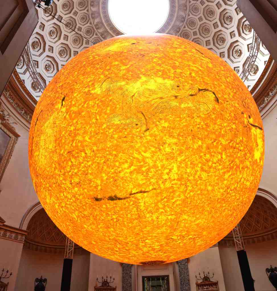 Jerram’s brightly illuminated piece is 7 metres in diameter, and totally dominated the grand – 19 metres high – saloon hall in which it was suspended. The scale is mind-blowing, with one centimetre of the sculpture representing 2,000 kilometres of the real sun’s surface. Clearly, our sun is one really big dude. As if to make the point, displayed in an adjacent room and made to the same scale was a tiny model of the Earth. It really put us in our place; this planet, which to us seems impossibly huge, is a mere pimple when viewed from a cosmic perspective.